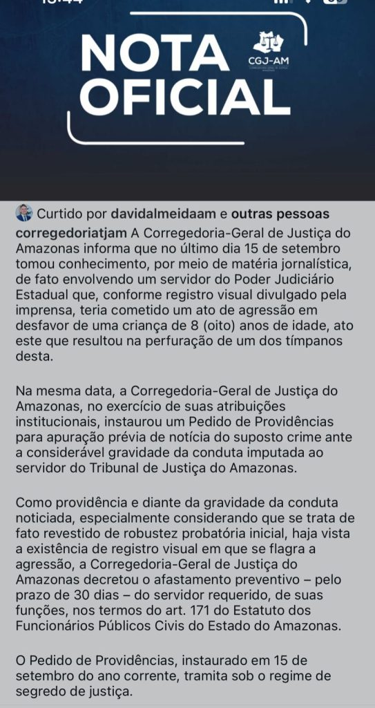 “Como providência e diante da gravidade da conduta noticiada, especialmente considerando que se trata de fato revestido de robustez probatória inicial, haja vista a existência de registro visual em que se flagra a agressão, a Corregedoria-Geral de Justiça do Amazonas decretou o afastamento preventivo – pelo prazo de 30 dias – do servidor requerido, de suas funções”, diz o texto da nota.